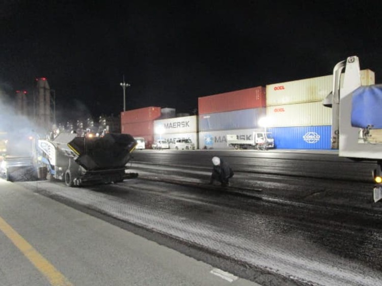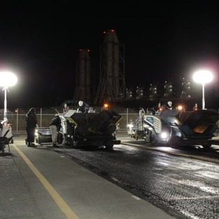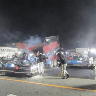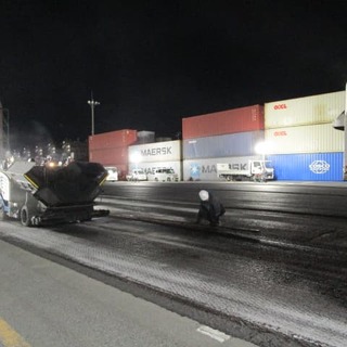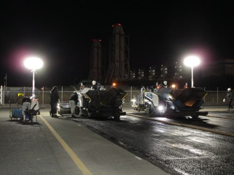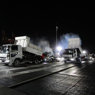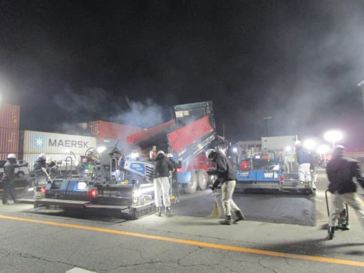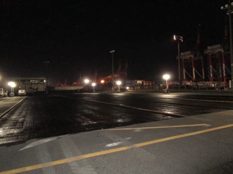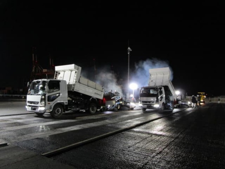 ふ頭修繕工事(飛島村) ホーム > 現場日記一覧 > ふ頭修繕工事(飛島村) ふ頭修繕工事(飛島村) 2026.01.24 コンテナヤード舗装修繕の現場に視察に行って来ました。13時から夜までの作業だったので夜食を持って行きました。舗装する面積が多かったので、フィニッシャー2基で並走しながら舗装作業を行いました。 やっぱり2台並ぶと迫力がすごくありますね!